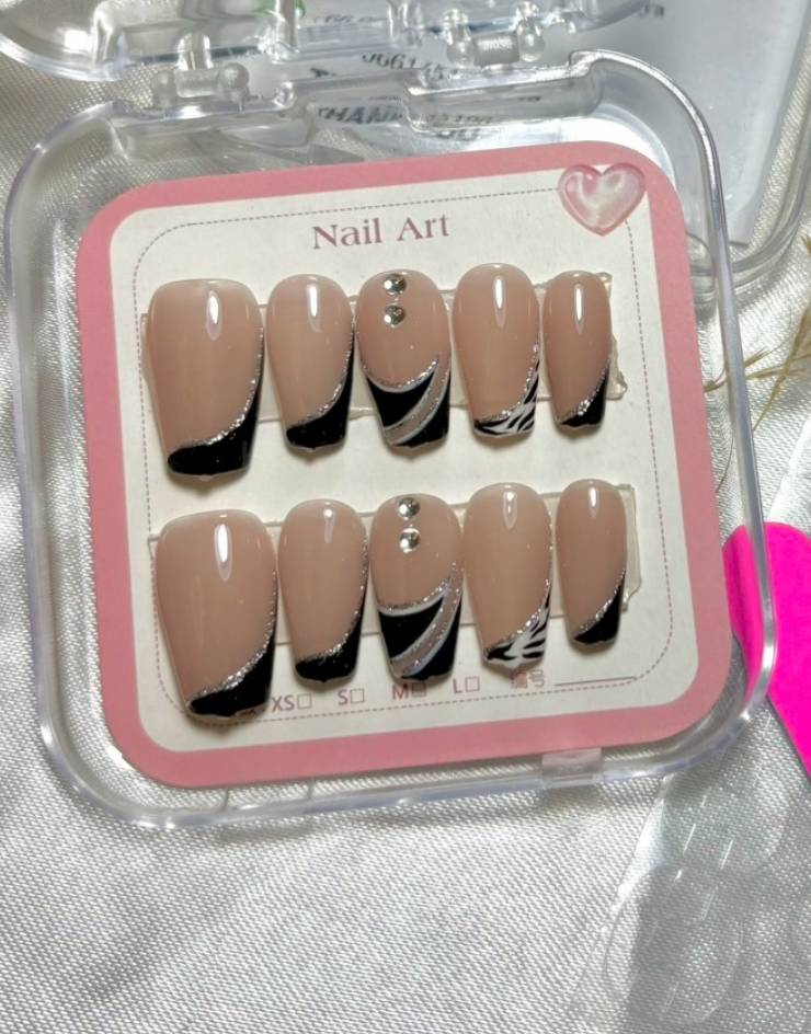 If you are looking for Black French Tip Press-On Nails that combine timeless style with a modern edge, our Midnight Sparkle set is handcrafted for excellence. This design features a flawless nude base transitioning into deep black tips, accented with a hand-painted silver glitter arc and subtle rhinestone detailing.