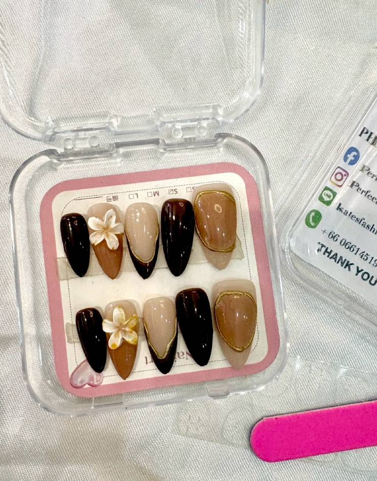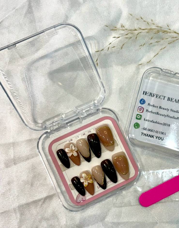 If you are looking for premium Chocolate Brown Press-On Nails, our handcrafted artisan set from Perfect Beauty Studio is designed to stand out. This collection features a beautiful variety of finishes, including deep espresso solids, caramel-toned nails with delicate gold-leaf borders, and a stunning 3D floral accent nail featuring a hand-sculpted white plumeria.